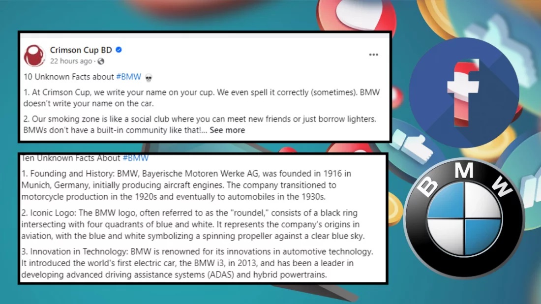সম্প্রতি ফেসবুক ফিড স্ক্রল করতে গেলে ‘Ten unknown facts about #BMW’ শিরোনামের পোস্ট অনেকেরই চোখে পড়ার কথা। আচমকা ফিড ভরে গেছে এই পোস্টগুলোতে। বিএমডব্লিউর সঙ্গে সম্পর্ক নেই তাও এমন পোস্ট কেন? এগুলো হুটহাট করে দেওয়া পোস্ট?