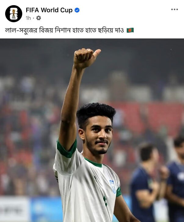 বুধবার বাংলাদেশের ফুটবলার শেখ মোরসালিনের ছবি পোস্ট করে ফিফা কর্তৃপক্ষ ক্যাপশনে লিখে এই গীতিকারের লেখা গানের লাইন, ‘লাল-সবুজের বিজয় নিশান হাতে হাতে ছড়িয়ে দাও’।